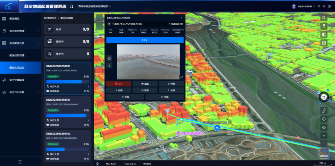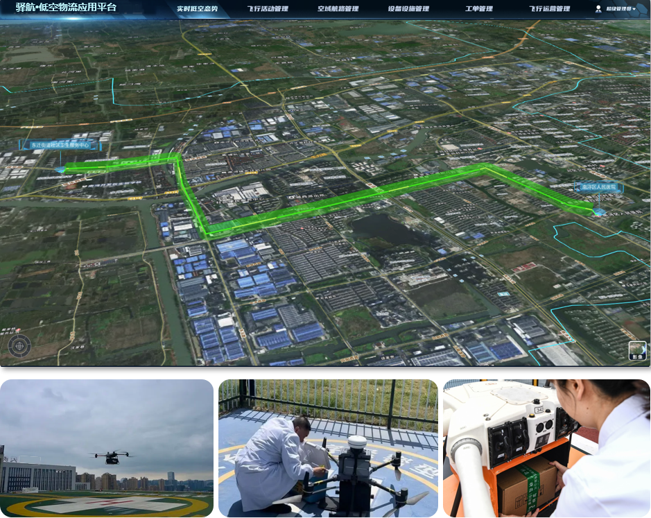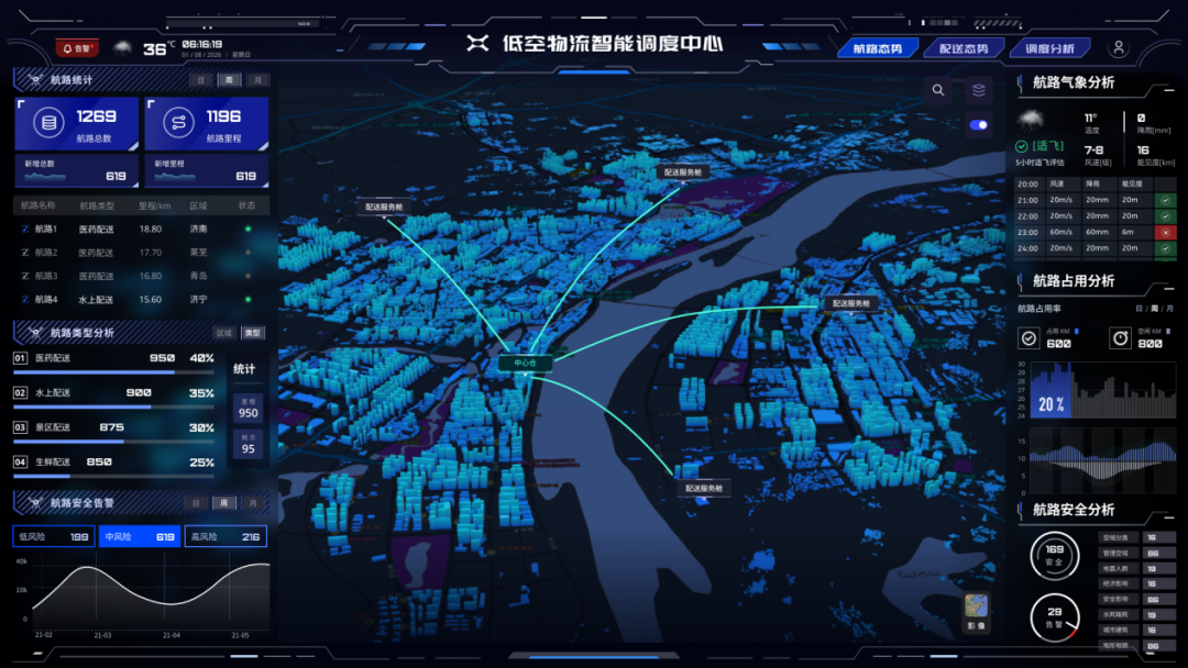 基于云端低空气象、电磁、空域管理,实时分析计算飞行数据和周围环境数据,智能远程调度飞行路线和航速保障配送运输机安全飞行;