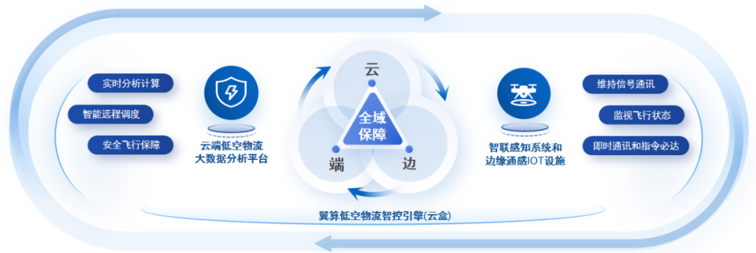 基于智联感知系统和边缘通感IoT设施(局部区域部署)互联,维持与飞行器的信号通讯和监视飞行状态,填补信号盲区,多向数据互传实现“云-边-端”即时通讯和指令必达;