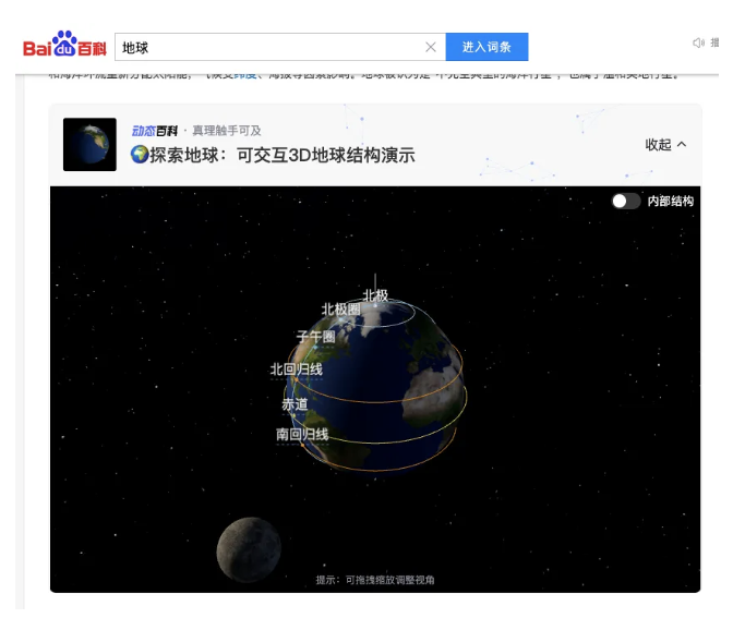 早在今年1月,百度百科便宣布推出 AI 知识交互产品“动态百科”, 推动知识传递从被动接收向主动探索转型。该平台通过可视化模型与交互式操作(如点击、拖拽及参数调节),把抽象原理转化为可视化、可操作的动态影像,直观呈现知识背后的原理脉络与逻辑关联, 打破传统知识获取的静态与单向模式,降低复杂知识的理解门槛。例如,在“太阳系”主题的动态百科中,用户不仅能查阅文字描述,更能可视化观察八大行星的实时运行轨迹、透视其内部构造、对比其天体特征。