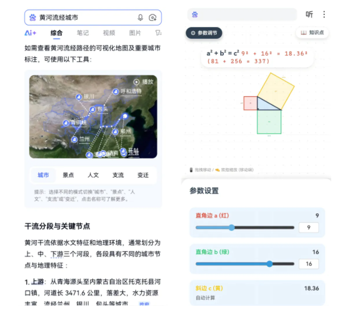 在百度搜索的部分结果页里,用户可以直接拖动、点击、调整页面元素,让内容发生变化。例如可以拖动太阳系,看行星之间的真实距离;也可以顺着黄河一路点下去,了解它流经的城市;甚至可以把分子结构拆开看清内部构成;还可以试试小孔成像的物理原理;调一调参数,看勾股定理的变化是怎么发生的......