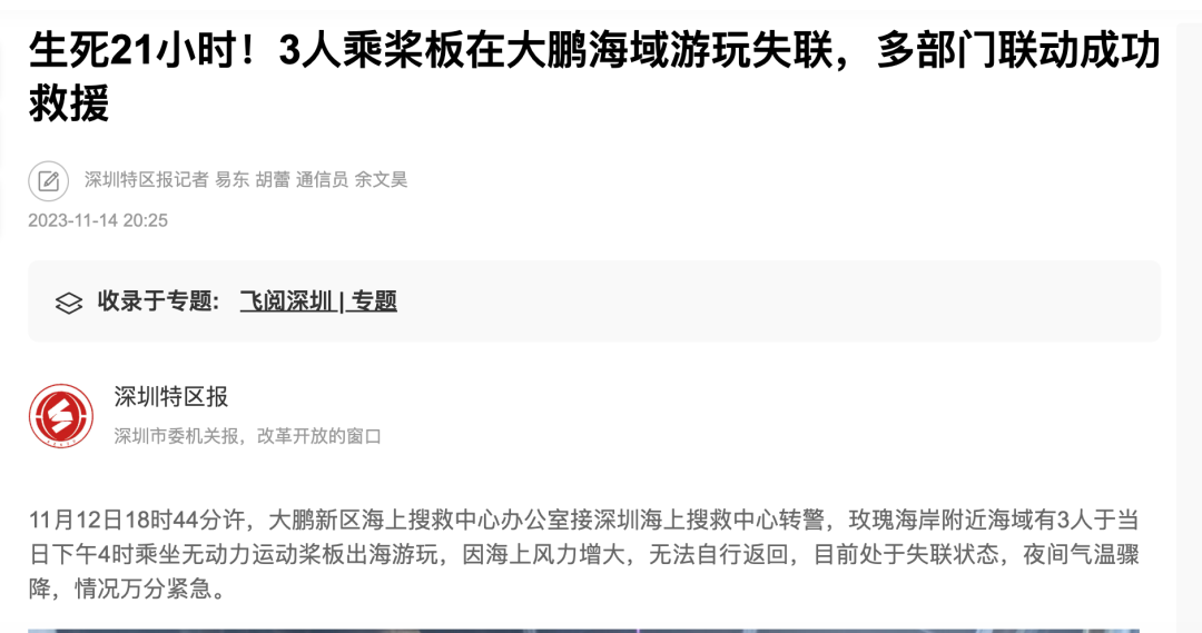 2023年11月的一个夜晚,深圳大鹏海域,三名游客乘坐无动力运动桨板出海游玩,因海上风力突然增大,无法自行返回,在夜间低温中失联。阵风6级,海面掀起1米多高的白头浪,能见度极差。