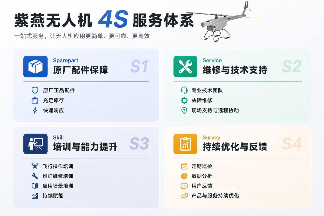 基于多年电动无人直升机应用经验,紫燕科技构建了覆盖全生命周期的4S服务体系,近期两个典型案例,直观体现了该体系在“及时响应 + 高效交付”方面的实际价值。