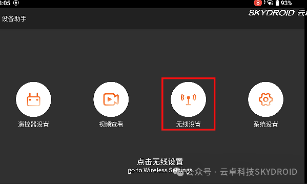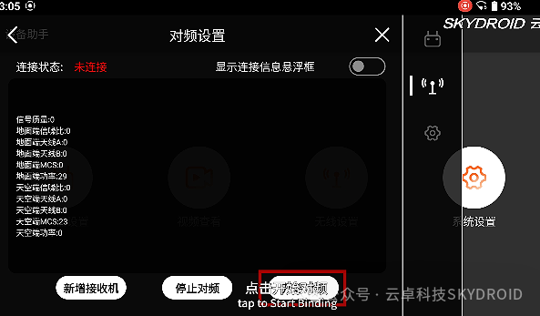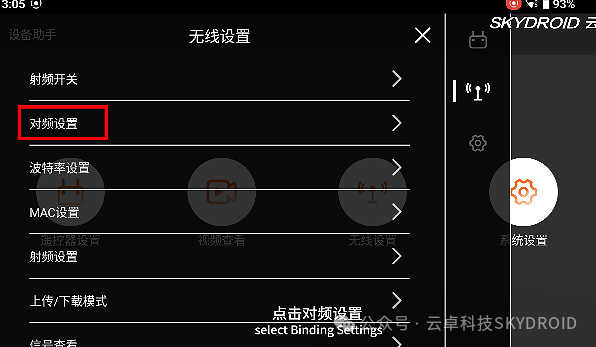 3、在遥控器端打开“设备助手”APP,依次点击【无线设置】->【对频设置】->【开始对频】 。