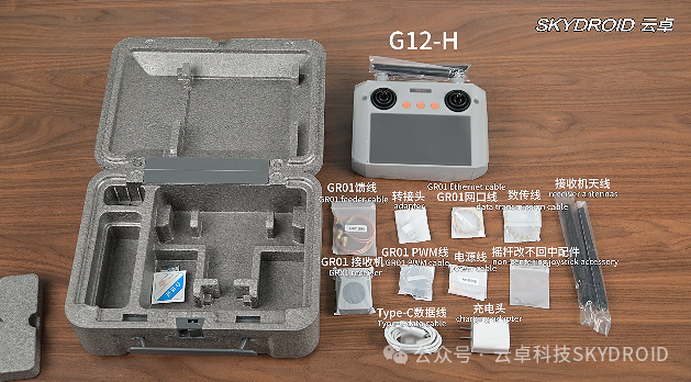 防护与配件:包装采用了高密度泡沫保护 。除了 G12-H 主机与 GR01 接收机,还标配了多款实用配件:GR01馈线、转接头、GR01网口线、数传线、GR01 PWM线、GR01电源线、摇杆改不回中配件、接收机天线、TYPE-C数据线、充电头 。