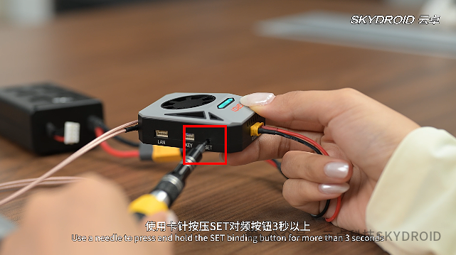 2、使用卡针按压接收机上的 SET 对频按钮3 秒以上,此时对频指示灯会进入快闪状态。