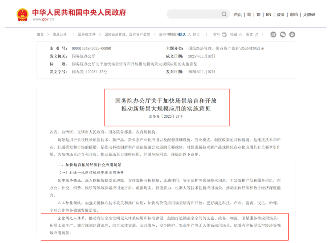 《国务院办公厅关于加快场景培育和开放 推动新场景大规模应用的实施意见》明确指出,推动海陆空全空间无人体系应用和标准建设,鼓励打造涵盖全空间的文旅、政务、物流等应用场景,拓展工业生产、城市规划建设治理、综合立体交通等无人体系应用场景。稳妥有序拓展低空经济等领域应用场景。