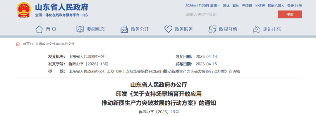 4月14日,山东省政府办公厅正式印发《关于支持场景培育开放应用推动新质生产力突破发展的行动方案》,聚焦20个重点领域,全面部署场景创新与应用,为新质生产力的突破发展注入强劲动力。