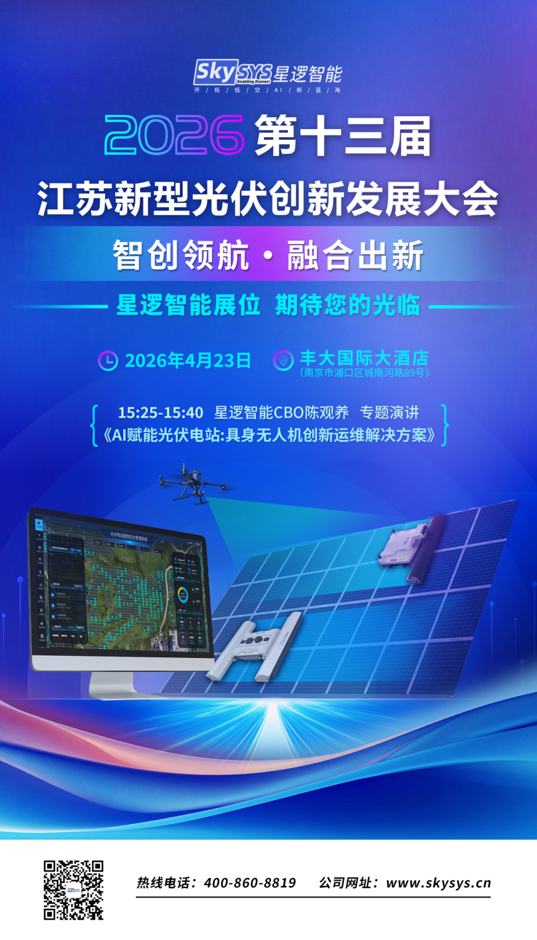 星逻智能将亮相2026年4月23日在南京丰大国际大酒店举办的第十三届江苏新型光伏创新发展大会。届时,公司CBO陈观养将于15:25-15:40发表专题演讲《AI赋能光伏电站:具身无人机创新运维解决方案》,诚邀各界朋友莅临星逻智能展位,共探低空AI与光伏运维的融合新路径。