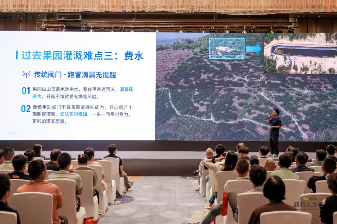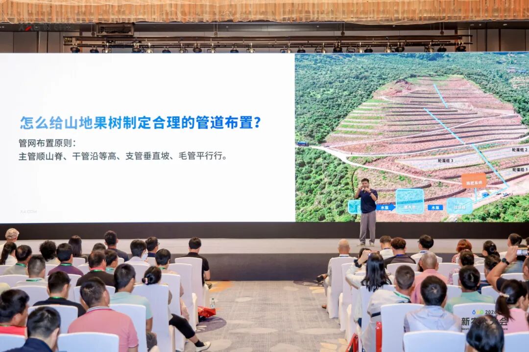 大会现场,极飞研发中心滴灌系统产品经理胡治强围绕山地果园,深度分享水肥高效管理与智能化建设。他提出,水肥一体化的核心优势,是遵循作物生长规律,按需供水,精准补肥,通过滴灌 / 喷灌定向输送至根系吸收区,提升吸收效率与利用效率,全方位支撑树体生长与果实发育。