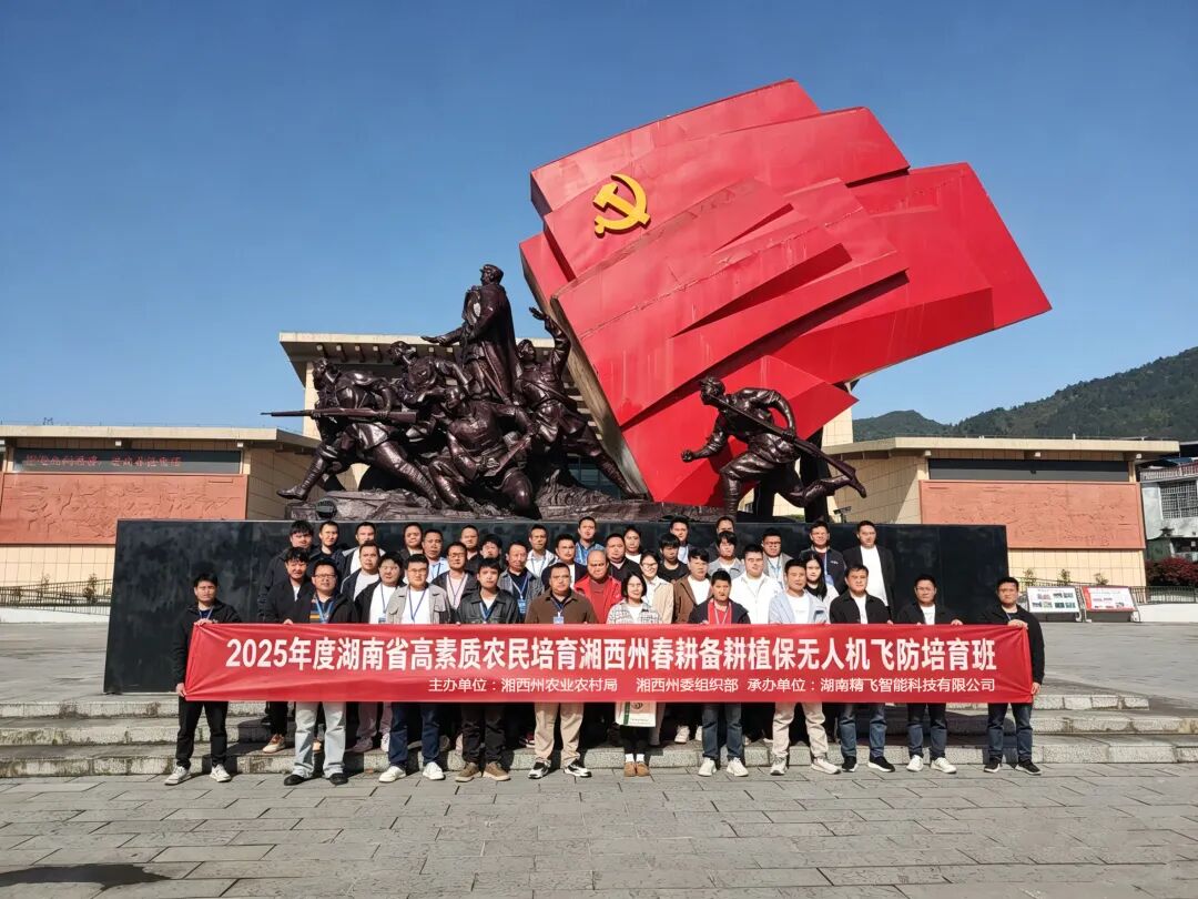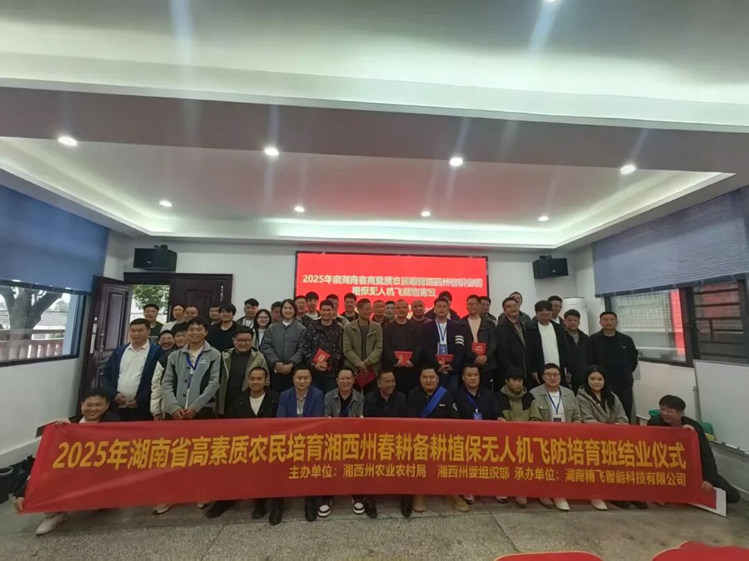 2026年4月21日,“2025年度湖南省高素质农民培育湘西州春耕备耕植保无人机飞防培育班”在湘西州圆满落下帷幕。本次培育班由湘西州农业农村局、湘西州委组织部主办,湖南精飞智能科技有限公司承办,来自湘西州各县市的45名农业从业者通过系统学习与实践,正式完成结业考核,成为推动湘西州农业智能化转型的“新农人”骨干力量。
