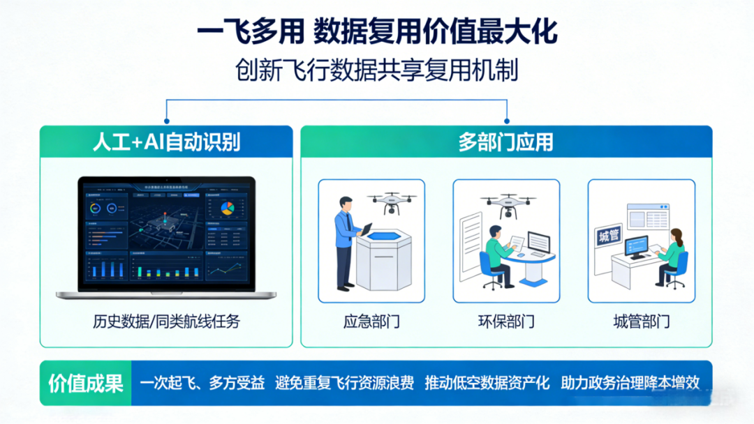 创新飞行数据共享复用机制,通过人工+AI自动识别可复用历史数据与同类航线。支持多部门共用一次飞行成果,实现一次起飞、多方受益,避免重复飞行造成的资源浪费,推动低空数据资产化,助力政务治理降本增效。