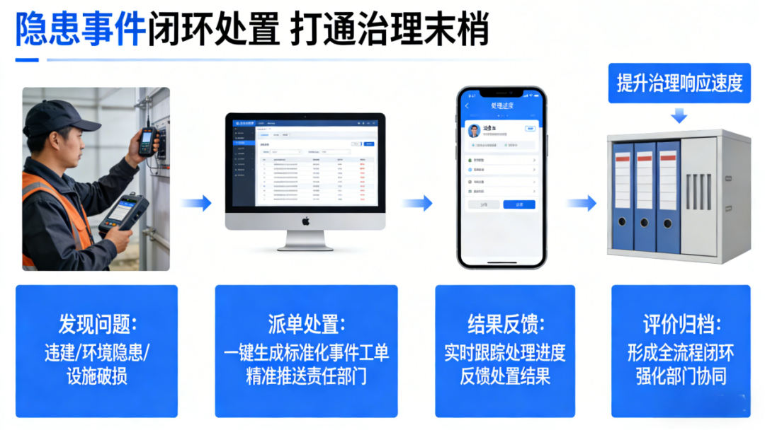 巡检发现违建、环境隐患、设施破损等问题后,一键生成标准化工单,精准推送至责任部门。实时跟踪处理进度、反馈处置结果,形成“发现问题 — 派单处置 — 结果反馈 — 评价归档”全流程闭环,强化部门协同,提升治理响应速度。