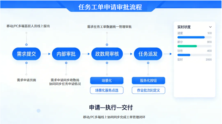 提供需求提交、内部审批、政数局审核、任务派发全流程线上化操作界面。流程节点清晰、权限分明、进度可查,支持场景化服务点选、作业频次自定义,大幅减少跨部门沟通成本,实现“申请 — 执行 — 交付”全过程闭环管理。