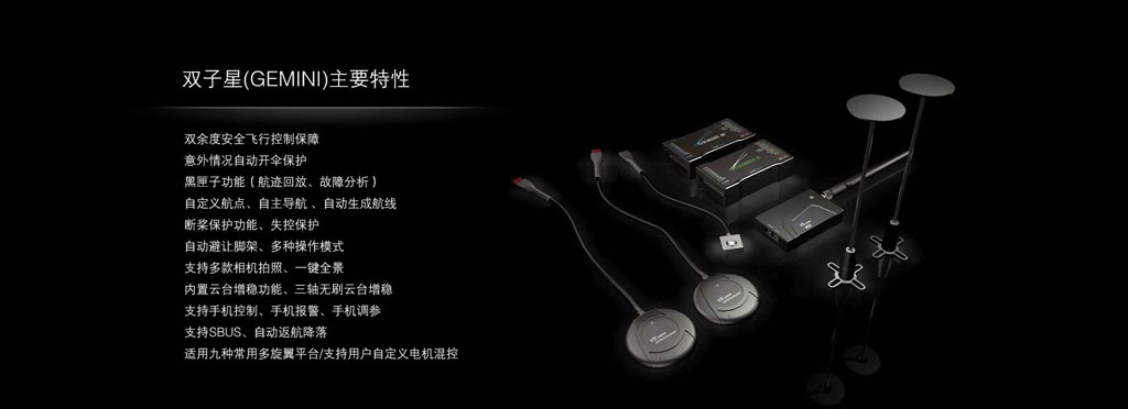 自动起飞&自动返航降落,飞行数据实时显示, 自动导航,航线飞行,手机姿态控制 三种控制模式,内置IMU,两轴云台增稳, 低电压LED报警,所点所到 航向锁定 支持无刷云台 |