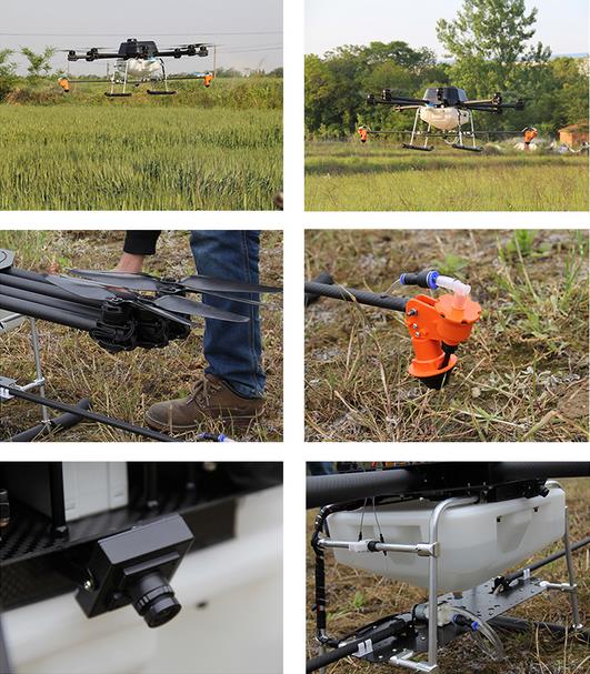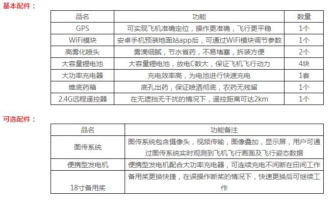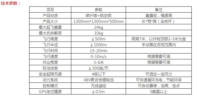 产品性能: 1、安全方便,垂直起降。无需专用机场跑道,可空中悬停,远距离操作,确保作业人员安全; 2、防治效果好,成本低。作业高度低,稳定性强,喷雾化程度高,可节约50%农用使用量,90%用水量; 3、效率高。日作业面积可达300亩; 4、实用性强,操作简单,使用和维护成本低。通过一周左右的培训,用户即可自行操作和维护整套八旋翼无人机系统。