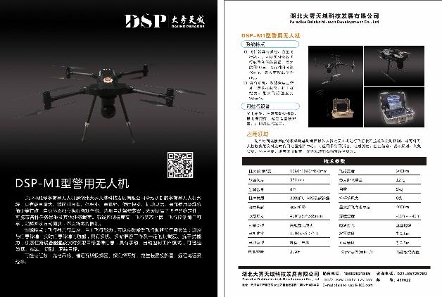 DSP-M1型八旋翼是湖北大秀天域科技发展有限公司全新研制的多旋翼无人机系统,具有载重量大、续航时间长、体积小、重量轻、使用快捷、机动灵活、操作使用及维修简便等特点,自成体系独立执行各项任务。选用自动驾驶装置,大大提高了飞控的稳定性,可携带各种任务吊舱及其他任务载荷。航线控制精度高,飞行姿态平稳,飞行控制简单可靠,起降回收方式简便,不受场地的限制。