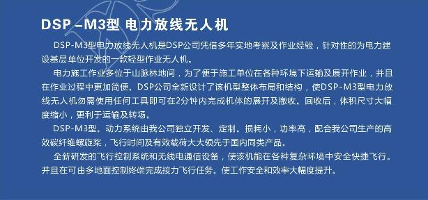 DSP-M3型电力放线无人机是DSP公司凭借多年实地考察及作业经验,针对性的为电力建设基层单位开发的一款轻型作业无人机。