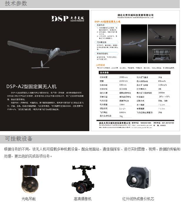 DSP-A2型固定翼无人机是DSP公司自主研发的一款机型,机体结构采用新型复合材料,材质选用美国DuPont公司高强度碳纤维合成材料和铝合金材料、7075铝合金抗拉强度≥560MPa。结构拟用框架式结构,保证了机体结构稳固。在材料实验室对无人机机体制造材料进行力学、耐腐蚀和抗拉强度等方面测试。采用功率1100W电机,和锂离子电池。外形设计复合空气动力学原理,在多项指标上均处于国内领先水平。其广泛应用于地质测绘、航空侦察、城市规划、气象侦测、环境监测、森林消防、石油管理监测等诸多领域。具有安全、高效、稳定等特点。