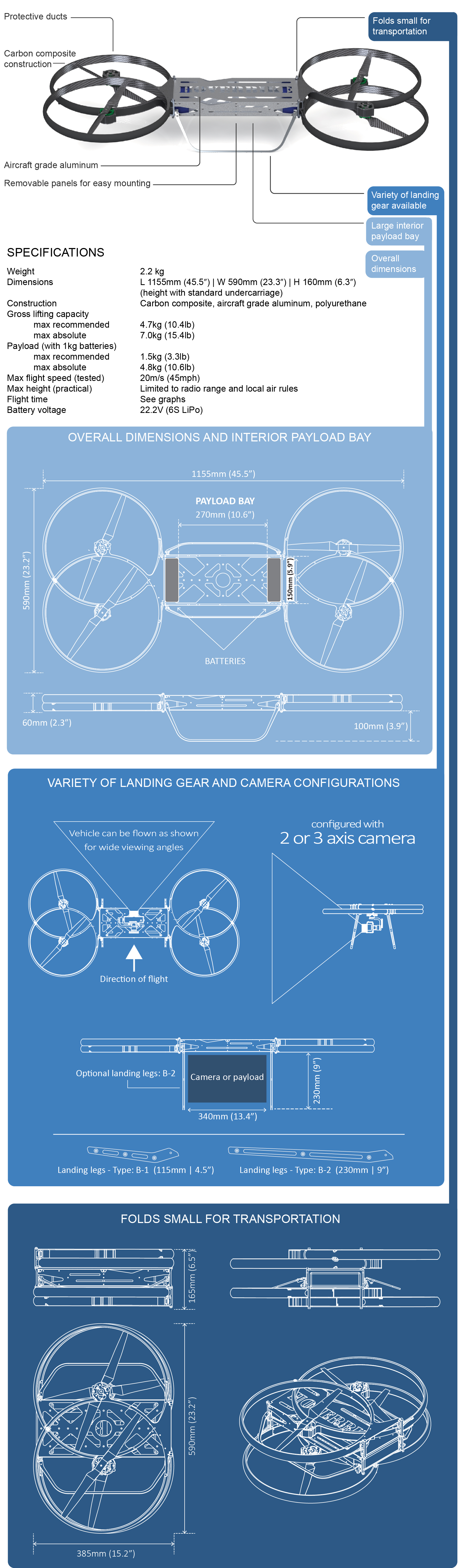 This drone is an almost identical 1/3rd scale model of the new quadcopter design for the full-sized (manned) Hoverbike and was built and test-flown before we even began work on the full-sized Hoverbike. It was originally created to test various elements of the new full scale prototype that we are now building.