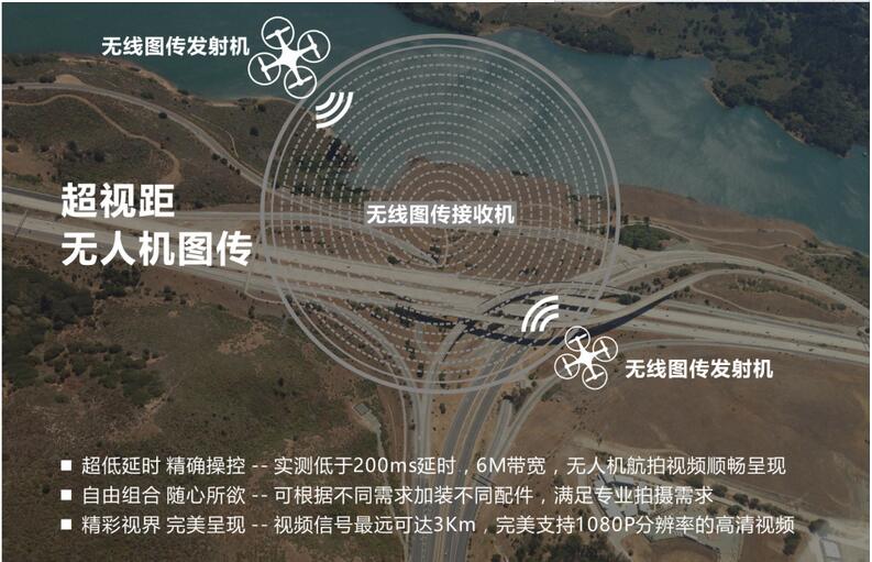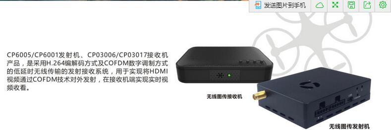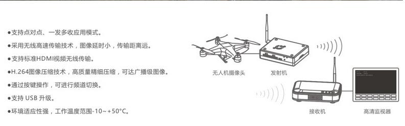 1. CP6005无人机/航拍图传系统发射机应用及特点 2. 支持标准HDMI视频无线传输。 3. 标配全向天线(选用不同功率和天线可实现2KM-15KM传输距离) 4. 无线传输,图像延时200ms。 5. 整机功耗小于8W。 6. 整机重量小于100克。 7. 支持两路串行数据通道传输。 8. 采用H.264图像压缩技术,高质量精细压缩,可达广播级图像。 9. 通过按键操作,可进行频道切换。 10. 具备频道选择性,频道杂散抑制特性。 11. 支持MINI USB升级。 12. 典型12VDC供电,支持电压范围7V-30V,具有过压保护及电源极性反接保护功能。 13. 外形小巧便携。 14. 环境适应性强,工作温度范围-10~+50°C。