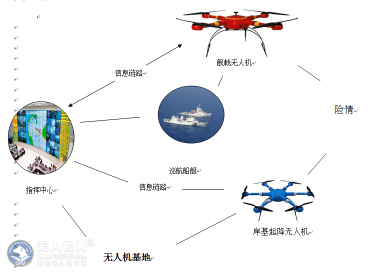 对于海上的危险现场,需要进行船—无人机联合调查取证、定位,无人机起到扩大船艇搜寻范围的作用 |