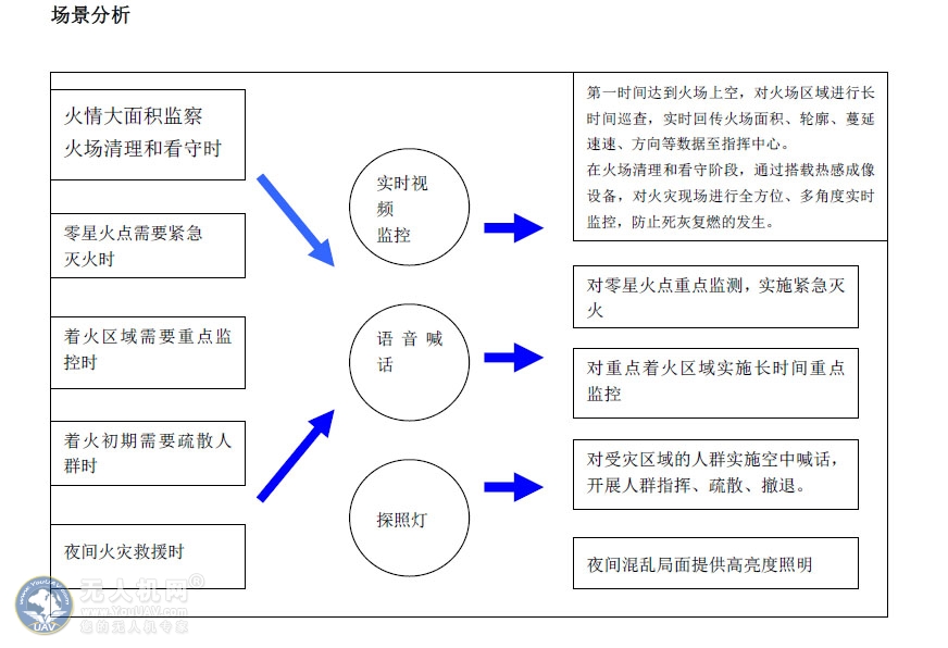可搭载喊话模块,对着火区域内的人群实施空中喊话,实施人群指挥、疏散、撤退等;可搭载探照灯模块,对夜间火灾现场混乱局面提供高亮度照明。