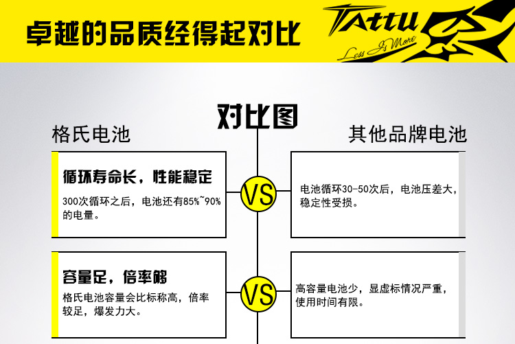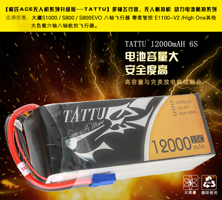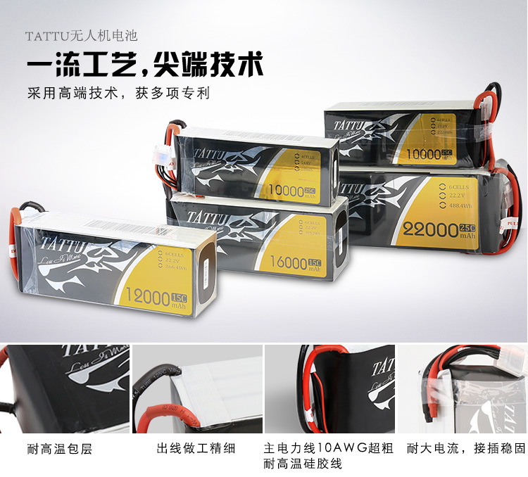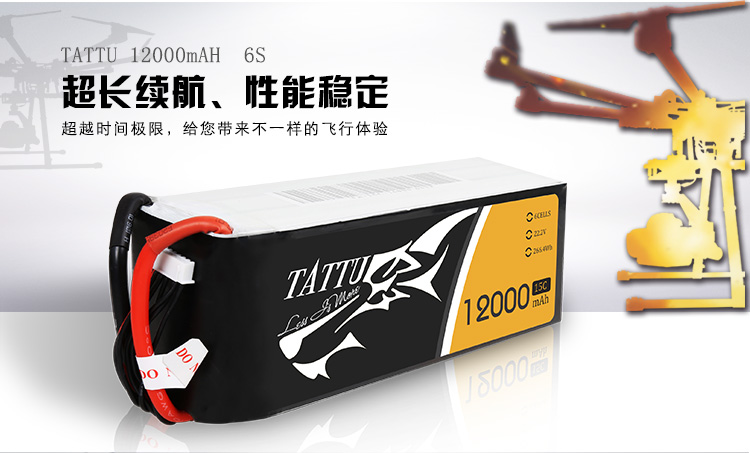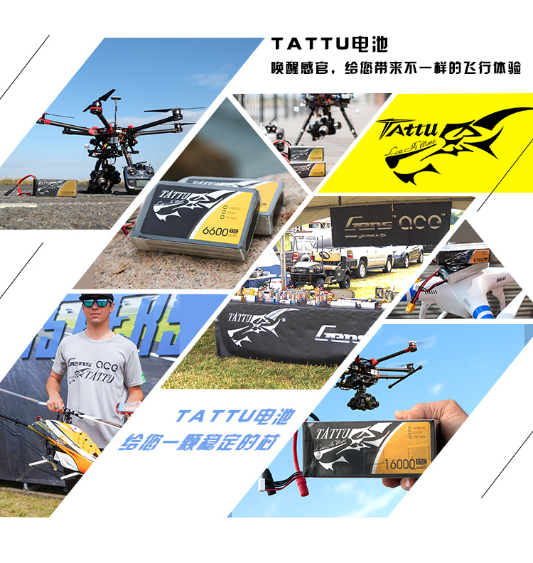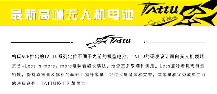 TATTU全新无人机系列电池定位为无人机行业的专业品牌,TATTU再一次颠覆了模型的概念,让广大用户对无人机动力配套有了全新的认识。我们一直在致力研发新品以更好的配合无人机产品的飞行需求,TATTU闪耀面世,意味着格氏品牌在无人机行业的全新变革,无论从外观包装还是电芯工艺我们都力求完美。 TATTU针对无人机工业配套,可在影视航拍、农业植保、地质勘测、 森林防火、抗洪抢险、环境监测等领域广泛应用,相信可以给广大用户带来不一样的飞行体验。因为专注,所以选择;因为专业,所以信赖。