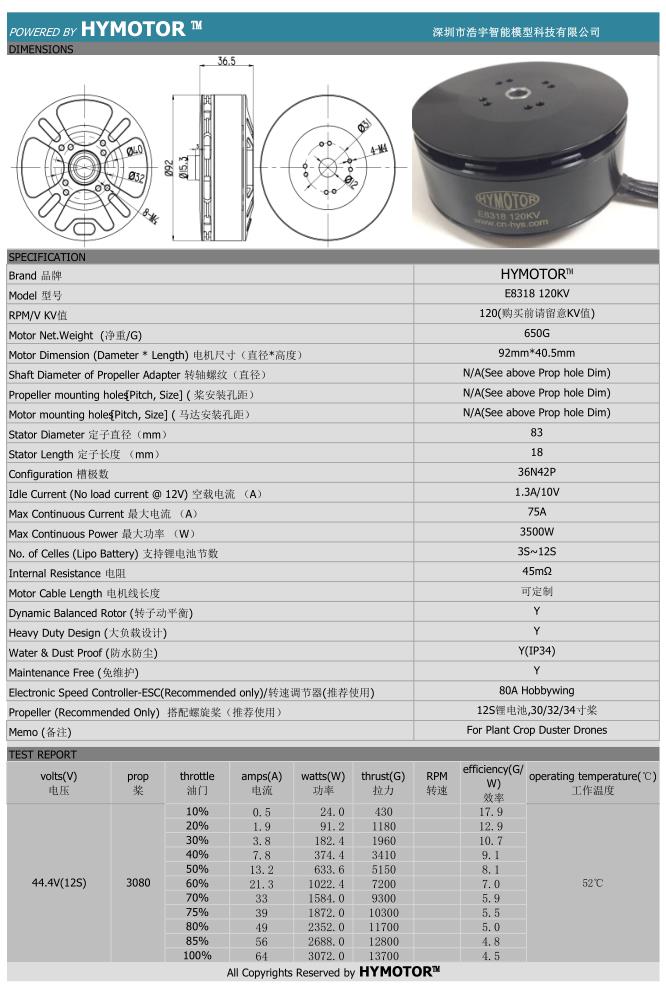 HYMOTOR E8318 120/100/90KV无刷电机 植保机马达