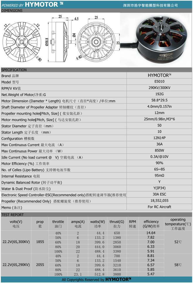 HYMOTOR E5010 290KV无刷电机 植保机/航拍机马达