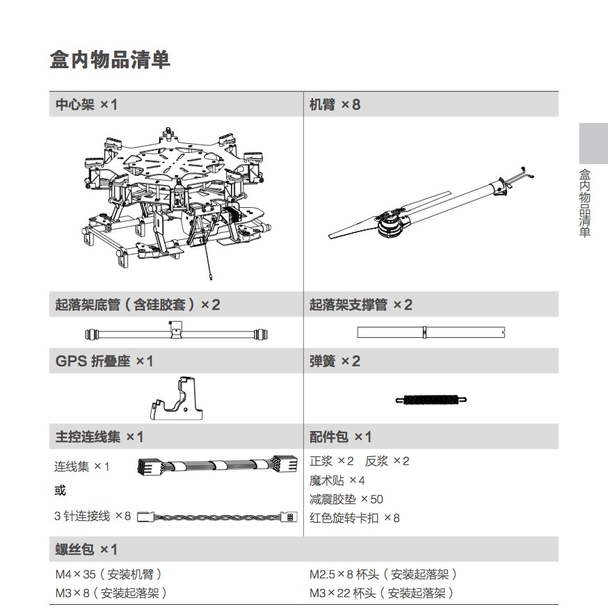 S1000+ 采用 V 型 8 旋翼设计,主要结构部件均采用质量强度比极高的碳纤维复合材料,在保证机身结构强度、刚度的同时大幅减轻重量。机身结构的系统性能完全匹配兼容 DJI WKM/A2 多旋翼飞控。快速的响应频率使你获得无与伦比的操纵感。