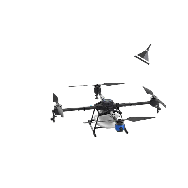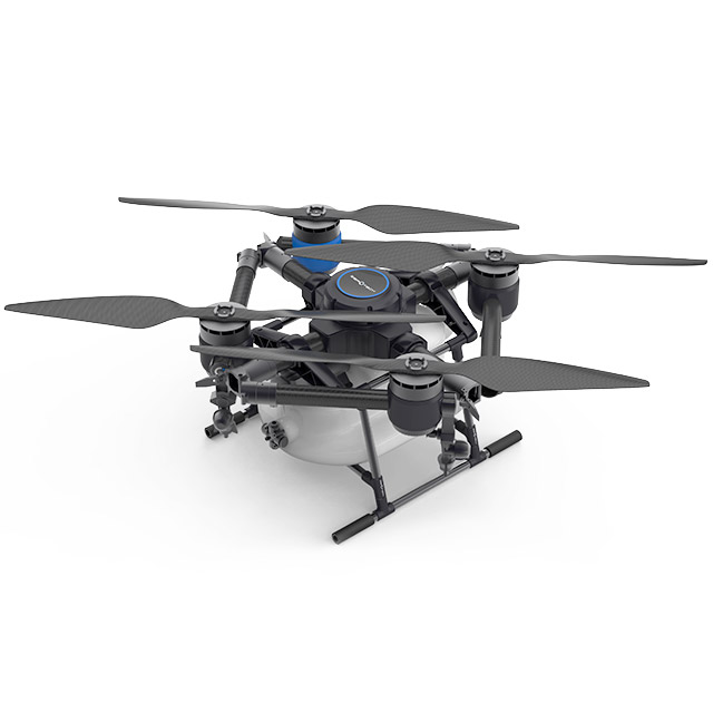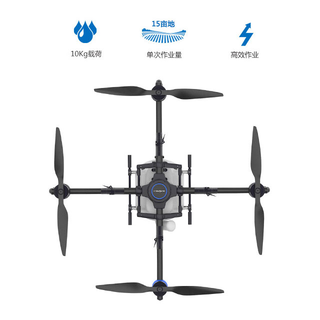 采用更适合农业喷洒的四轴"十"字型机体结构设计,在避免重复喷洒的同时带来更大的药液喷幅,使喷洒更加均匀、高效。额定载荷10kg,单次作业面积约15亩田地,其效率是人工喷洒的数十倍。
