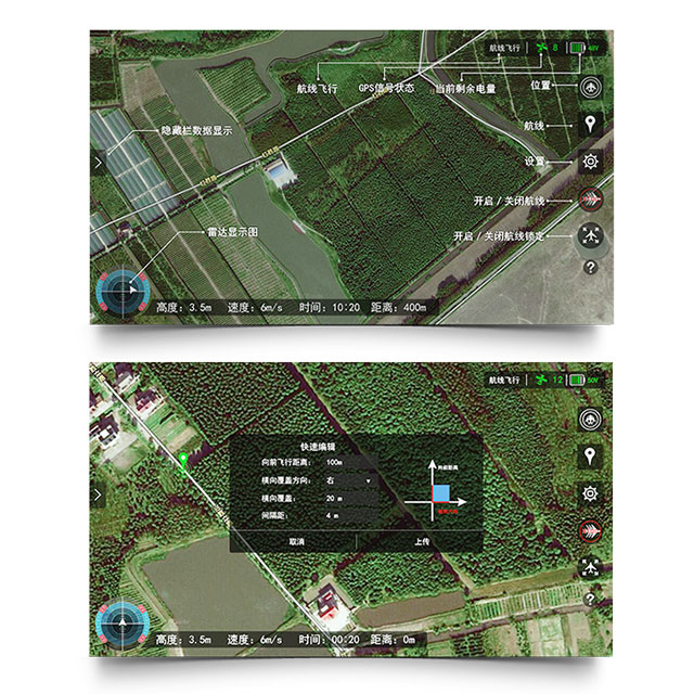 专为农业应用量身定制的人性化APP,可为非规整地形提供航线规划。具有航线记忆功能,并能计算喷洒面积,进而辅助作业人员更精准地掌握用药量。此外,还支持"断点续喷"功能,可避免作业区域的遗漏。