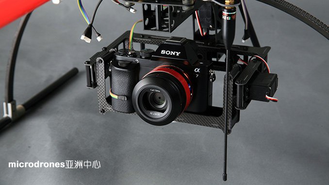 APS画幅微单数码相机,1600万像素,支持1080P视频拍摄,16mm F2.8镜头,16GB的记忆卡。全碳纤维双轴自稳云台及相机控制系统,可控制俯仰和滚转,可遥控拍摄,可遥控切换视频/图片拍摄,可实时传输取景画面。