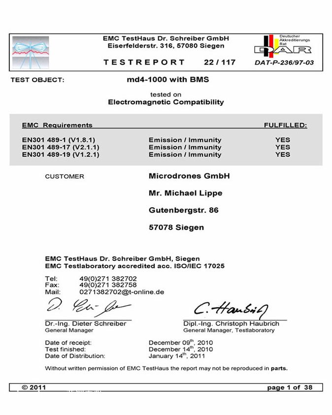 md4系列四旋翼无人机在同类产品中拥有业内最强的野外环境适应性,可以在最高6级风和暴雨下正常工作。除了通过德国专业机构的EMC电磁环境兼容认证,经过德国第三方专业机构的严格测试,md4-1000四旋翼无人机被确认在高压电磁环境下具有良好的抗干扰性和安全性,md4-1000四旋翼无人机的电机甚至还通过了火场高温环境测试。