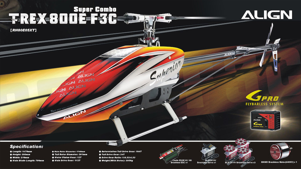 专为新F3C赛事设计的全新T-REX 800E F3C,800级距机身搭配全新FL主旋翼头组与新一代的Gpro无平衡翼系统,同时可以穿上新推出的800F3C机壳,是专为F3C竞赛而生,顶级旗舰机种。