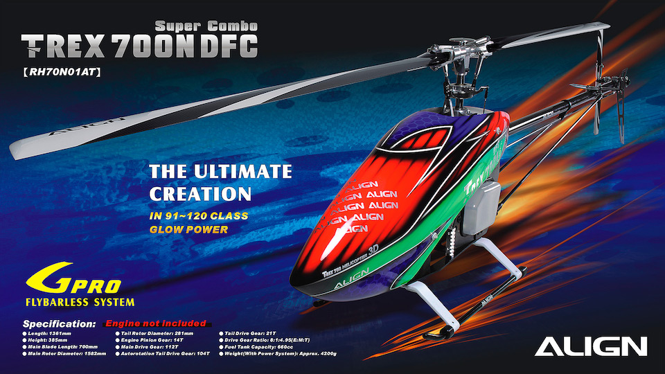 亚拓以多年来累积的直升机研发技术,于2008年推出专业竞赛型燃油直升机T-REX 700N,外型精美价格实惠让700级燃油直升机普及推广到一般消费者,开创亚拓一个全新的里程碑。这里亚拓为这位功臣外观性能再次提升,让全新的T-REX 700N DFC展现于各位面前。 配备亚拓新一代Gpro无平衡翼系统,搭载更快速度CPU,处理速度提升20倍,加上全新架构的韧体程序,增加性能提升的程式补偿,让Gpro有更快、更细腻的反应,直升机性能达到巅峰。 Gpro人性化的调整方式,可以使用电脑调整外,还支援iOS、Android手机app,可以透过手机直接调整Gpro。 T-REX 700N DFC最醒目的特征就是窄机身的设计,与旧款一样兼具强度高与轻量化特色,外观还带给人简约紧实视觉效果;搭配DFC主旋翼头,让飞行动作更直接与更快的反应速度;纳入现行性能提升的改装件,M1斜主齿轮组与新型尾旋翼控制组,提升主齿轮耐用度与尾舵锁尾性能表现;采用加大容量油箱,迎合更大级数引擎的使用,增加3D飞行时间。 以极致性能标准来打造的T-REX 700N DFC,配备高效能3GX无平衡翼系统,让你透过引擎的咆哮声,再次感受热血沸腾的快感。