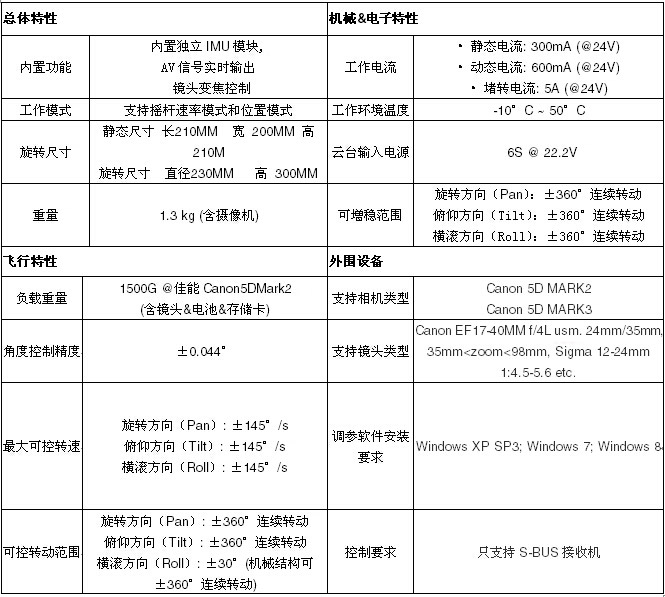 为行业应用而研发的5D专用三轴电机驱动云台,3轴均采用高精度无刷直流电机与自主研发的高速驱动模块, 结合精密的云台控制算法以及无人飞行器飞控姿态稳定算法,具有高稳定性、高精度、低振动,高扭矩等特点。即使飞行器处于高速飞行状态中,仍能够精准地控制您的相机设备保持稳定,基本实现拍摄图像的零抖动零漂移,使航拍画面得到最优的效果。同时可无缝对接5DMarkIII,只需选配相应的硬件即可。支持佳能Canon EF17-40MM f/4L usm镜头,可更换长度在98MM以内的镜头(卡口处开始计算)。