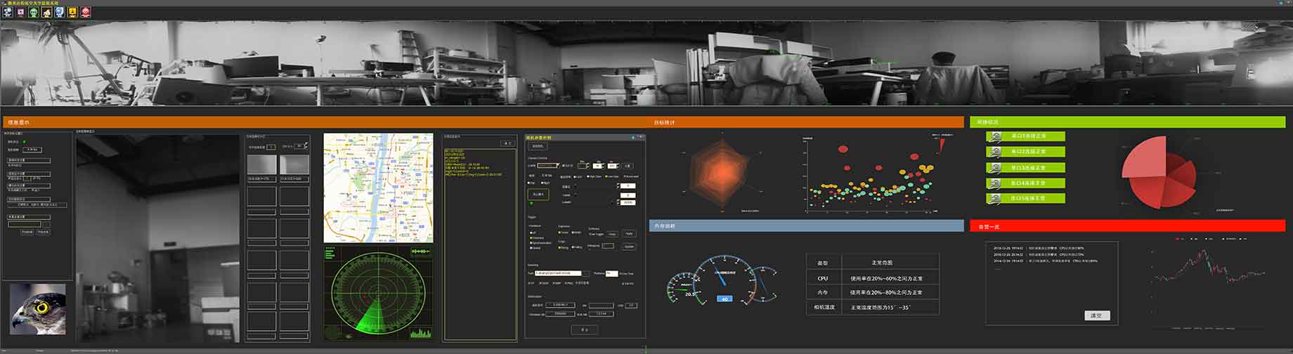 软件系统可以根据应用场景的光学特性自适应的调整图像动态范围积分时间等成像参数,可以充分利用各种探测器的动态范围等成像特性实现各种光照条件下的最优成像效果,同时目标检测和跟踪的性能不受成像参数自动调整的影响。软件系统可以根据各种天气条件(阴天、多云、大雾)采用自适应的智能信息处理算法,大大减小了天气对目标检测与跟踪性能的影响。整个系统可以很好的满足全天候、全时相的全景成像以及目标检测与跟踪要求。