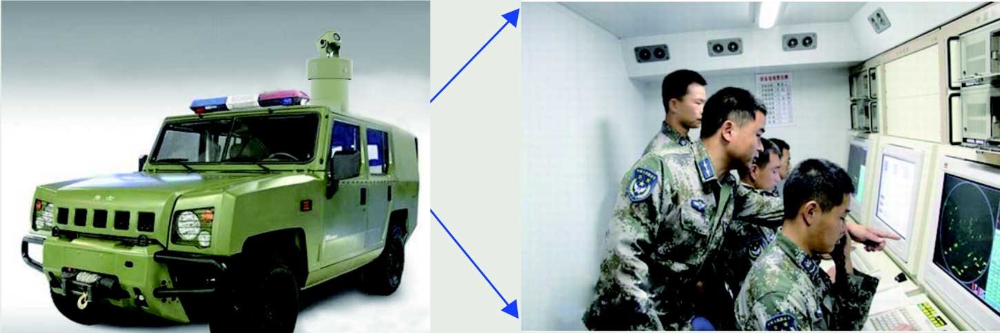对于重大军事活动,为了防止无人机非法窥视和恶意侵扰,可以采用车载机动部署的方式对活动区域空域进行监视和防控。另外,对于重大活动保障,为了特殊区域的安全防卫可以通过在目前公安和武警的应急保障车辆上进行机动安装实现对低空无人机的非法侵入进行监视和防控,同时可以为公安和武警后续的干扰和打击平台提供准确的目标提示,从而确保重大活动的人员和设施的安全。机动产品的形态见下图所示: