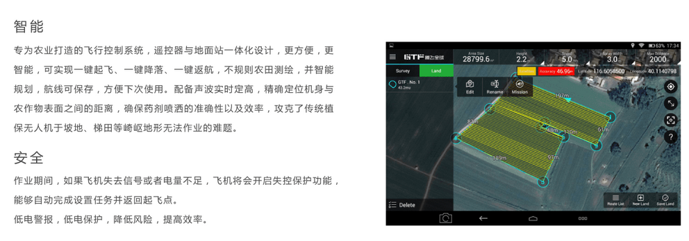 机身采用模块化设计,并拥有多项专利技术,实现了工业级无人机三防功能:防尘,防水,防腐蚀。整机设计分为三个模块,每一个模块都可以独立拆除更换,从根本上解决了三大难问题:组装难,维修难,保养难。夏天气温高,也是各种农作物病虫害的高发季节,为此,AG-10 专门配备了风冷系统,极大程度上缓解夏季高温作业散热难的问题,让忙碌的夏季作业更具保障。