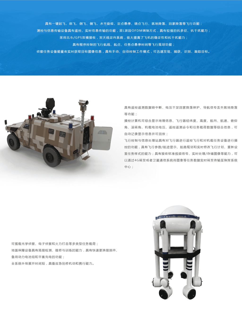 动力系统采用新一代专业无刷电机和电调,该无人机在灵活性和稳定性上有极大的提升,使机体能抵消大部分的震动,并提供更大的动力;机体采用可折叠结构,动力输出轴可90°折叠,利于储存、运输;具备遥控、自主飞行能力,可以实时修改飞行航路和任务设置。