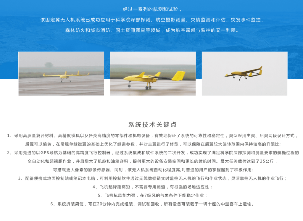 FW-25多用途固定翼无人机是专门针对探测和侦查而开发的高性能大载重无人机。该无人机系统具有高可靠性和便捷的操纵性等优异品质,同时采用双尾撑气动布局,采用滑跑起飞和滑降的方式,也可以弹射起飞和伞降回收的方式。可加装测绘和侦查等任务载荷,深部探测仪器。具备了完全自主化运行的特点,提供给用户更便捷、更可靠的操控、更灵活的运用以及对操纵人员更简化的培训要求,该无人机在同级别起飞重量的无人机中具有相对较长的航时。