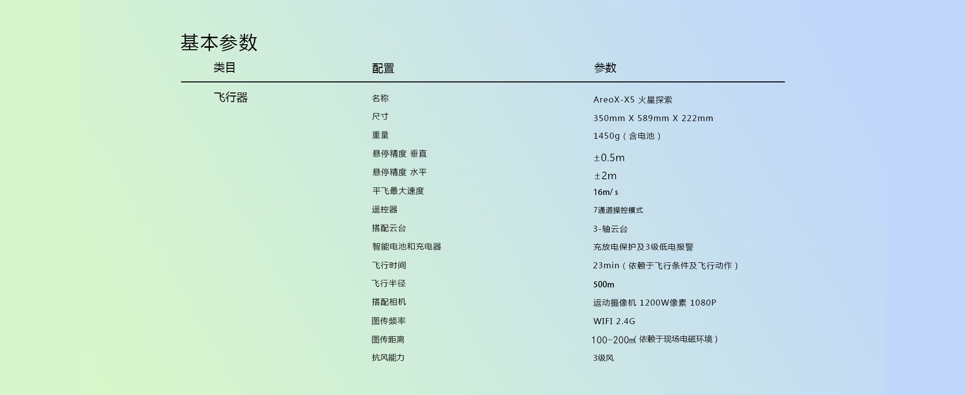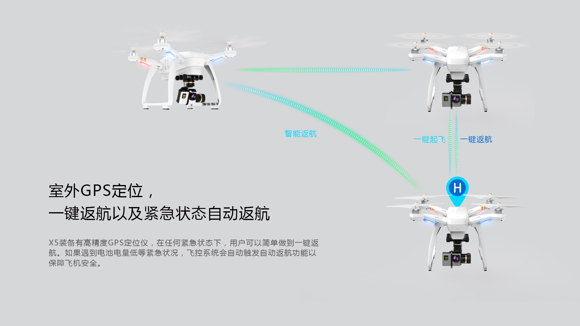 X5是一款1.5KG以下级消费类航拍多旋翼无人机,悬挂3轴稳定拍摄云台和高清运动摄像机,配备GPS+GLONASS定位系统以及光流超声波定位系统,具备优良的室内、室外稳定悬停,操作简单,用户体验优秀。除了具有WIFI图传功能以外,通过采用自研的智能遥控器,X5用户可以将拍摄到图像在社交网络即时分享,为广大普通消费类无人机用户带来了全新的用户体验。