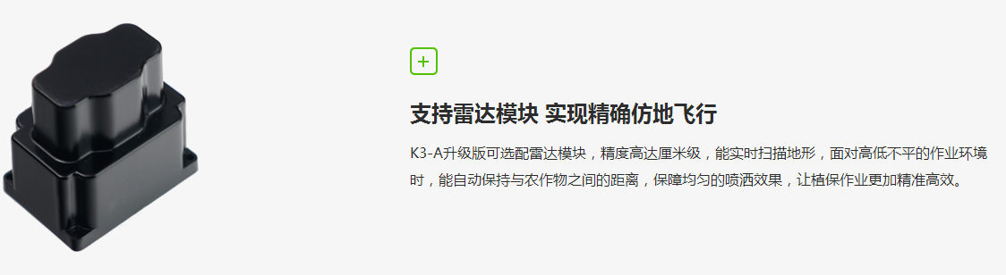 地形跟踪雷达实时反馈无人机相对飞行高度,能保证无人机与作物之间的相对高度不变。高达500hz的激光测距,精度在厘米级别。不会因为地形起伏、作物高低不平导致炸机。可引用于剃田、丘陵、山地等作业环境。