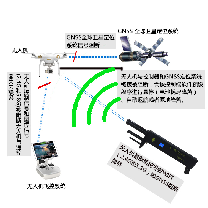 DZ01 PRO系列无人机反制系统不会击毁或者损坏无人机,其主要工作原理是干扰阻断无人机的飞控系统、信号传输系统、使无人机实现垂直着陆或自动返航。