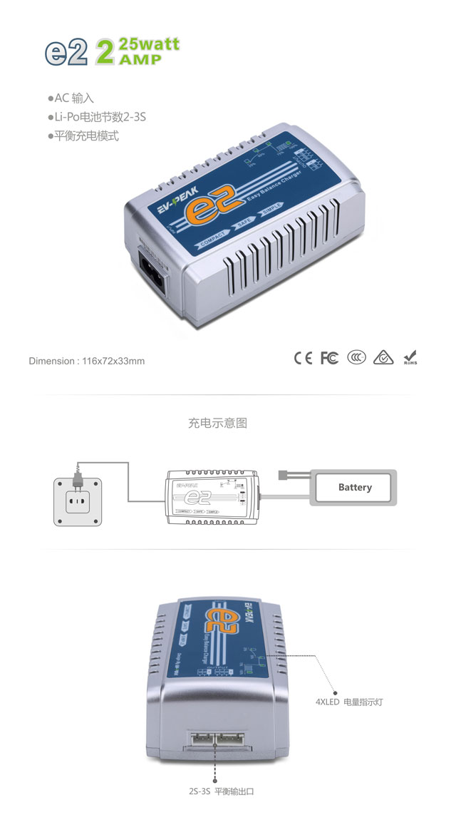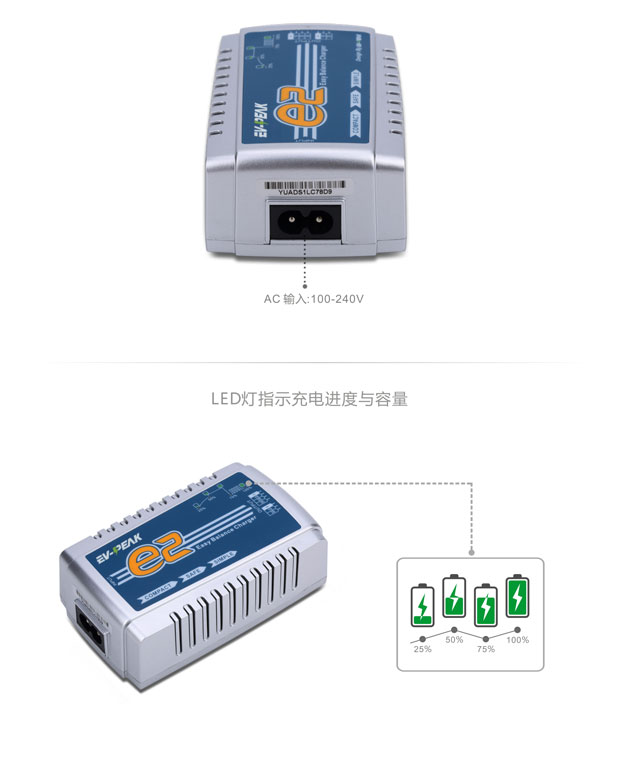 四颗LED显示电量(25%,50%,75%,100%),Lipo专用充电器,操作简单,只需将电池平衡口正确接入,充电器便开始工作。