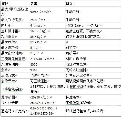 技术特性 1、任务载荷大于10公斤,适用于各类专业航拍摄像需求; 2、起飞重量最大35公斤,具备较强的抗风性能(6级风速); 3、采用双缸对置发动机,机体的机械震动较小; 4、标配油箱5公升,留空时间可达60分钟;