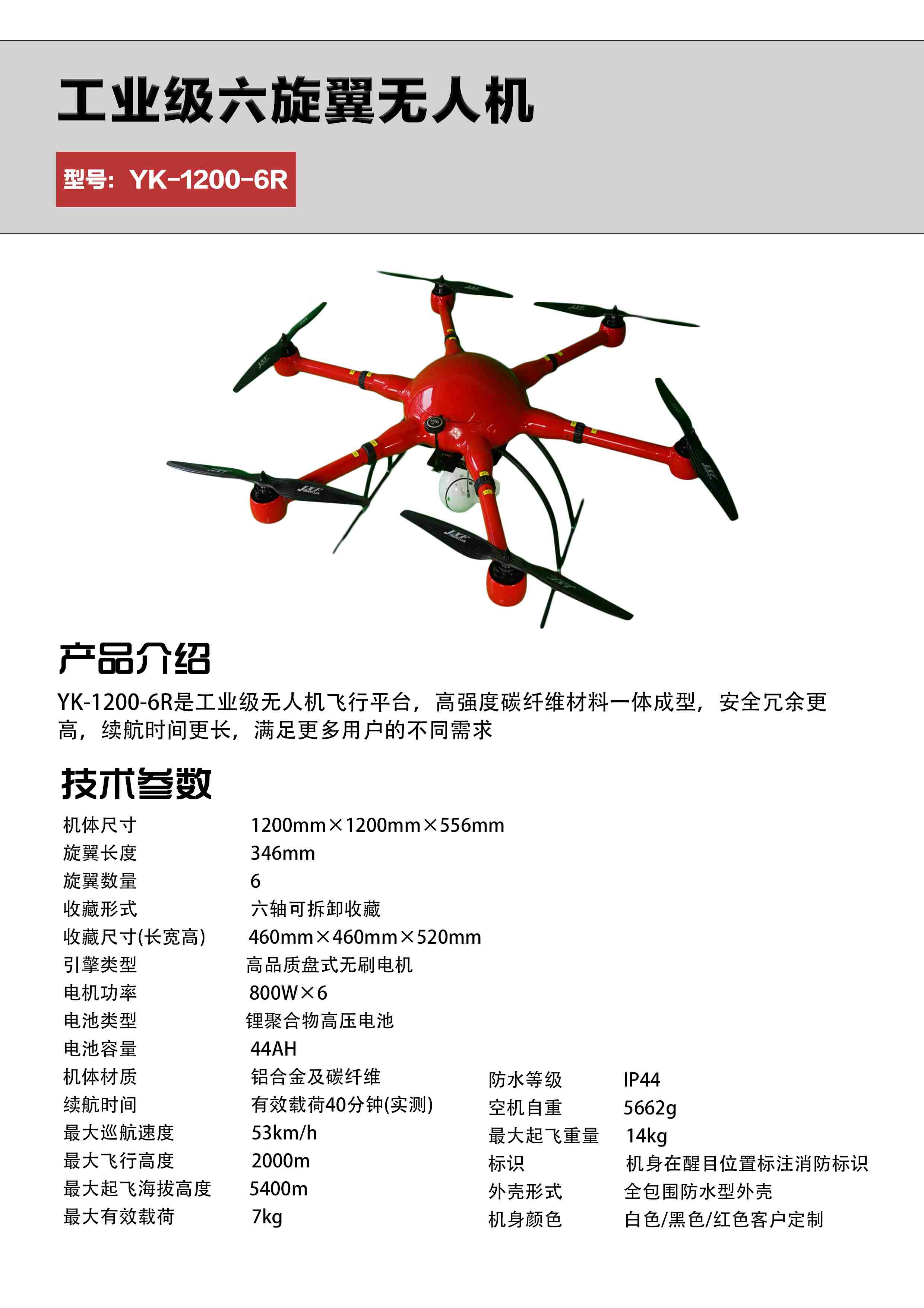 YK-1200-6R挂载任务载荷,留空时间测试,测试结果:经实地检验,我公司产品挂载1.5KG变焦吊舱,留空时间长达40分钟,同时受检的同级别厂家产品,无人能及,防水性能远高于同类产品!