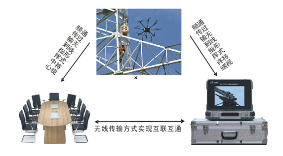通过无线通信技术进行大跨度范围现场巡线与远程管理的遥感,进行无人机的无线控制,并通过无线频点复用技术,同时传输高清实时视频,在地面手持设备上进行监视。通过远程传输功能,能在办公室或指挥中心实时遥测航拍影像及热红外图像,并具备智能避障和线路故障智能判断功能,实现远程运检管控作用,并与现有的应急平台实现无缝对接,与其他终端互联互通。