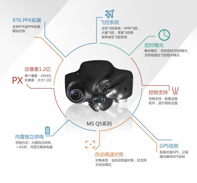 作为一款通用型倾斜摄影系统,该系统不仅支持多飞控平台的控制对接,还具备简单、牢靠、通用性强的直接结构,同时快拆机构可以根据不同机型快速订制,MS Q5系列可以挂载MS系列、大疆M600,各类多旋翼固定翼等飞行主机。